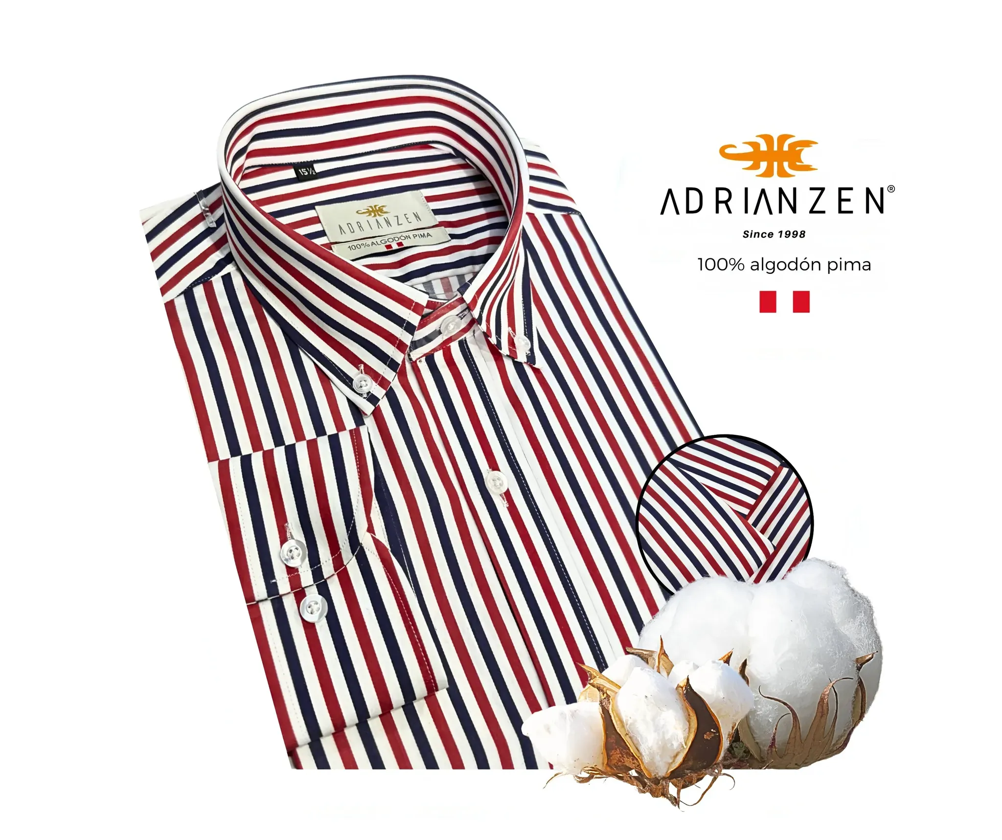 Tejido de algodón liviano; color líneas azul noche, rojo con fondo blanco ; suave y transpirable.